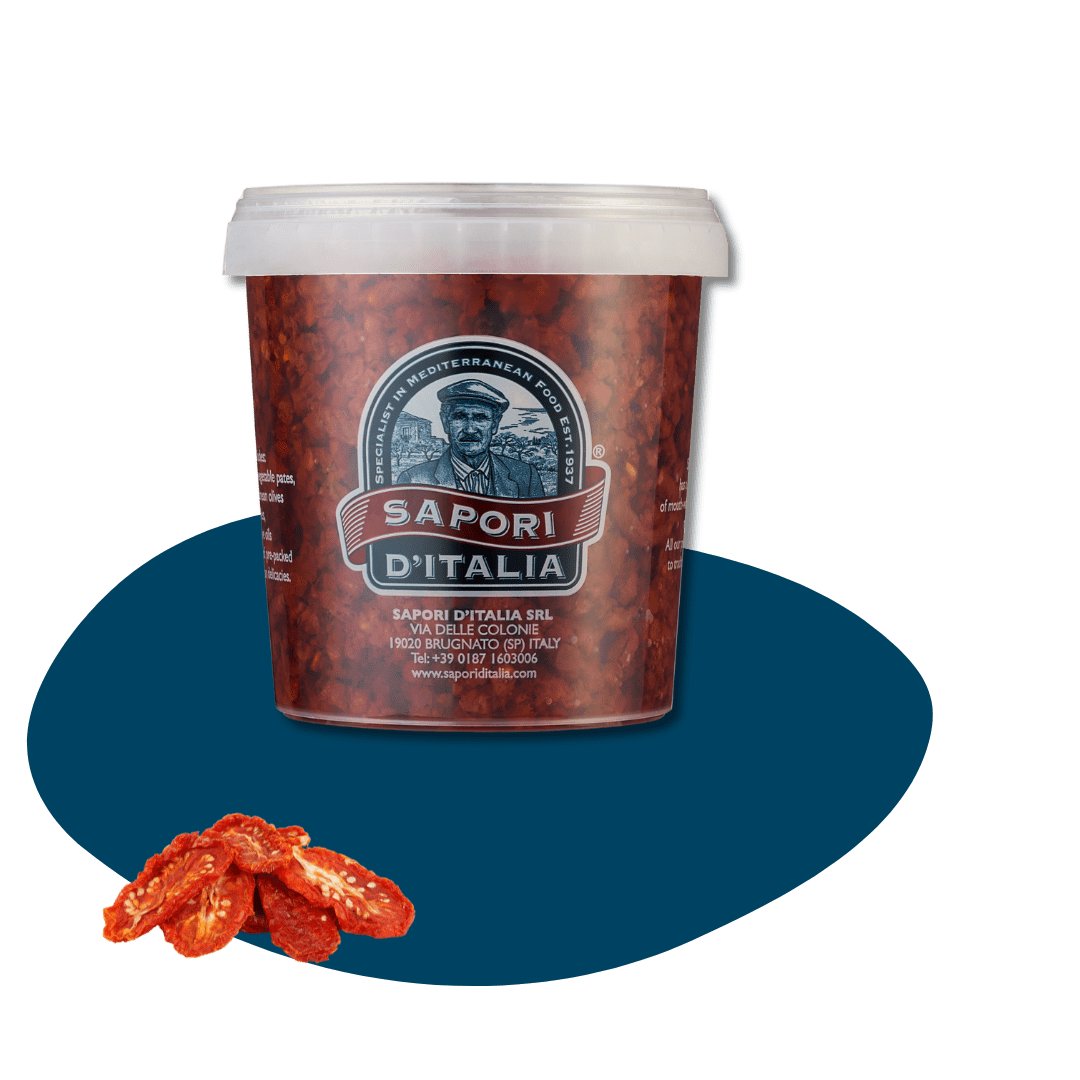 Il nostro Capuliato è preparato con pomodori secchi al sole, basilico Genovese DOP, pepe nero, aceto di vino e olio di semi di girasole, per un profilo aromatico deciso, leggermente dolce e piacevolmente sapido, con profonde note umami. Privo di conservanti artificiali, mantiene tutta la sua autenticità e ricchezza di sapore.