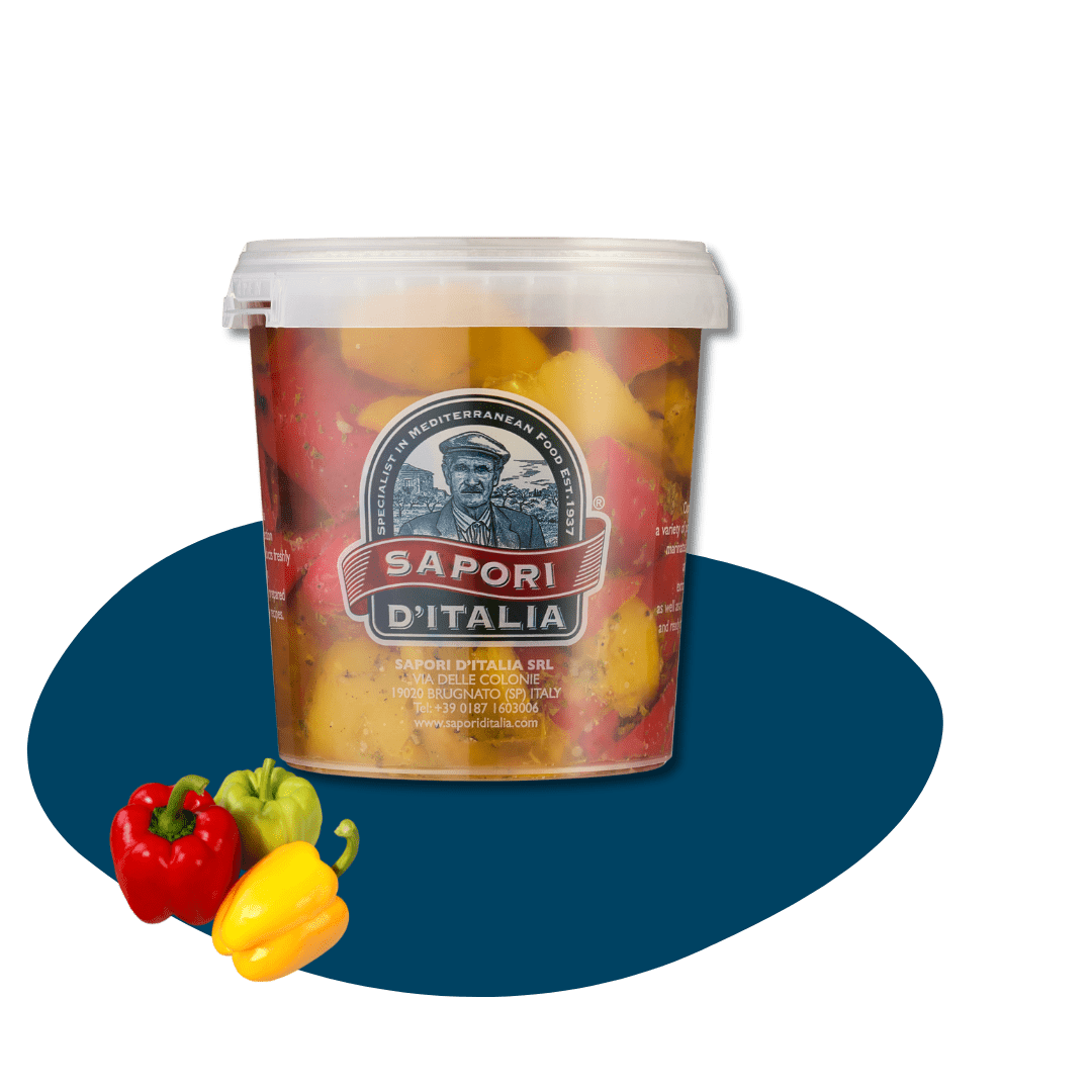 Cresciuti sotto il sole del Mediterraneo e marinati secondo una ricetta tradizionale italiana, i nostri peperoni rossi e gialli grigliati vengono arrostiti a fiamma viva per esaltarne la dolcezza naturale e la ricca nota affumicata. Successivamente, vengono marinati in olio extravergine di oliva, erbe aromatiche italiane, aglio, un tocco di peperoncino e il nostro pregiato basilico Genovese DOP, che dona una profondità aromatica unica.