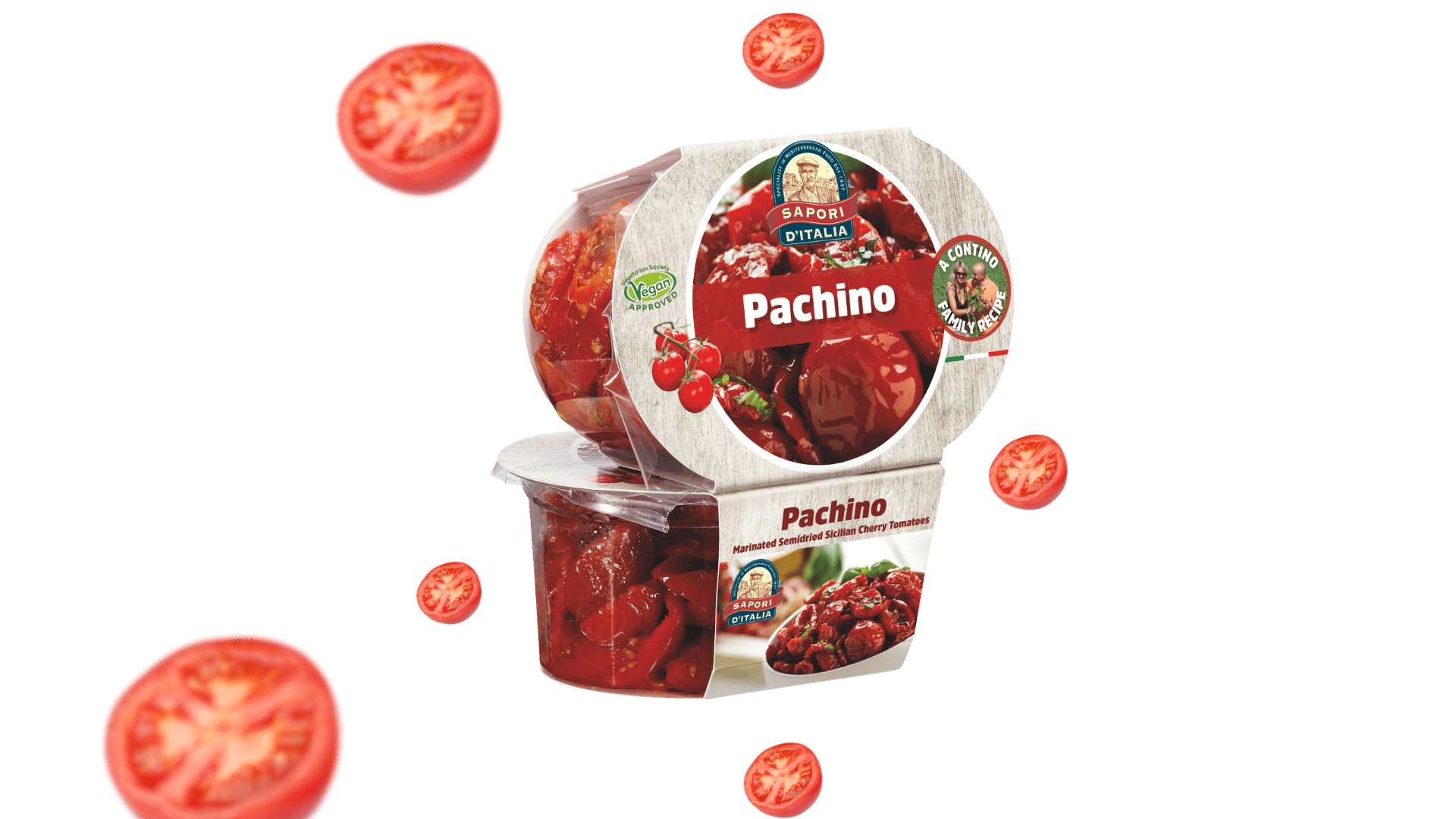Questi pomodori ciliegino semi-secchi, di Pachino, sono morbidi e ricchi di sapore.